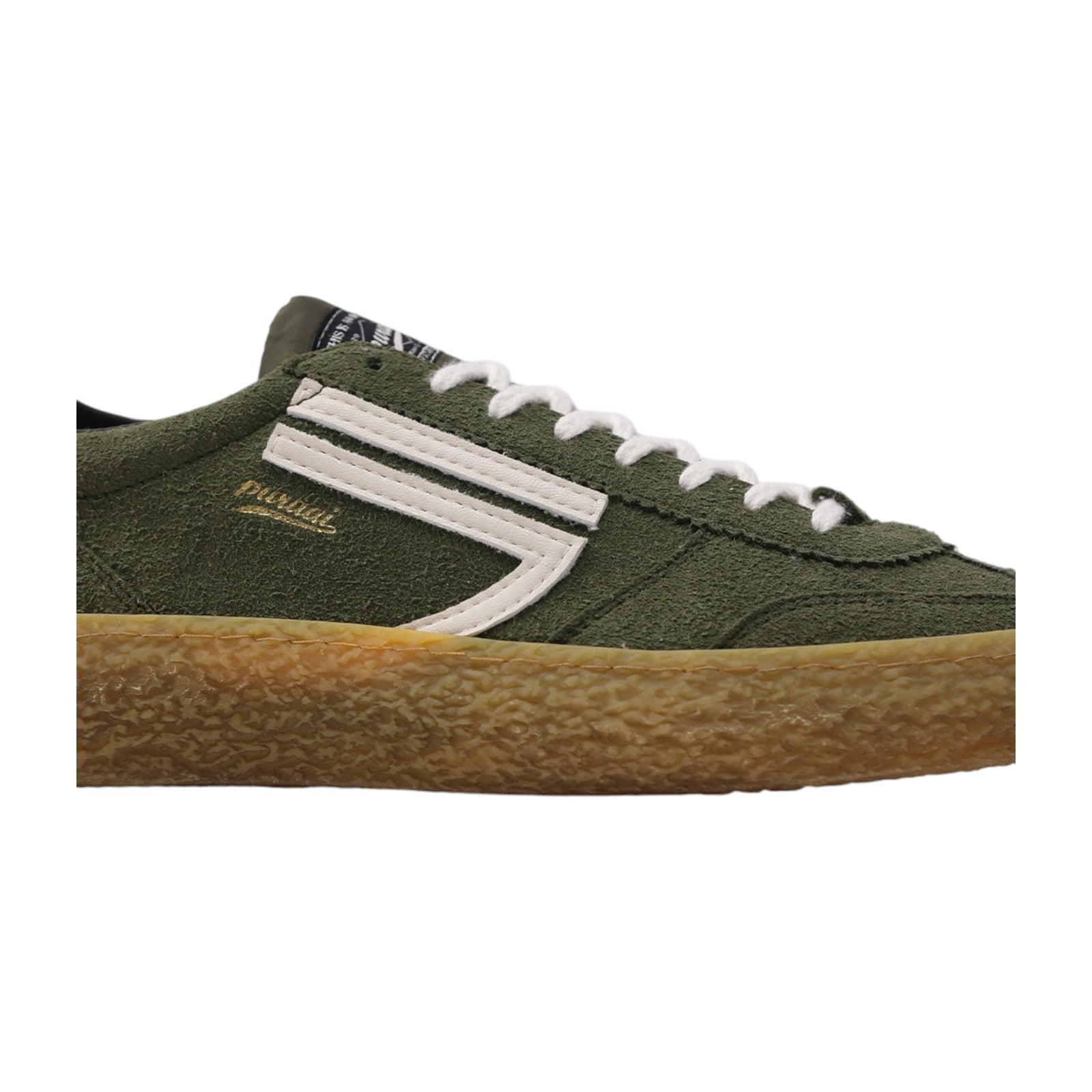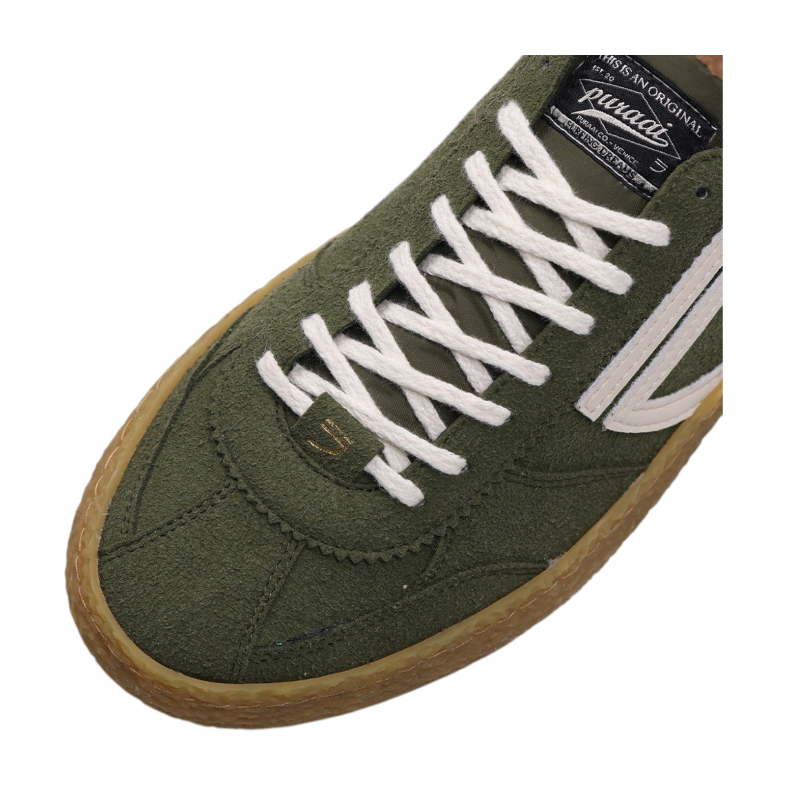 Microsuede peloso verde, logo bianco e dettagli neri.Suola color miele, doppio laccio verde e bianco. Finitura vintage.
