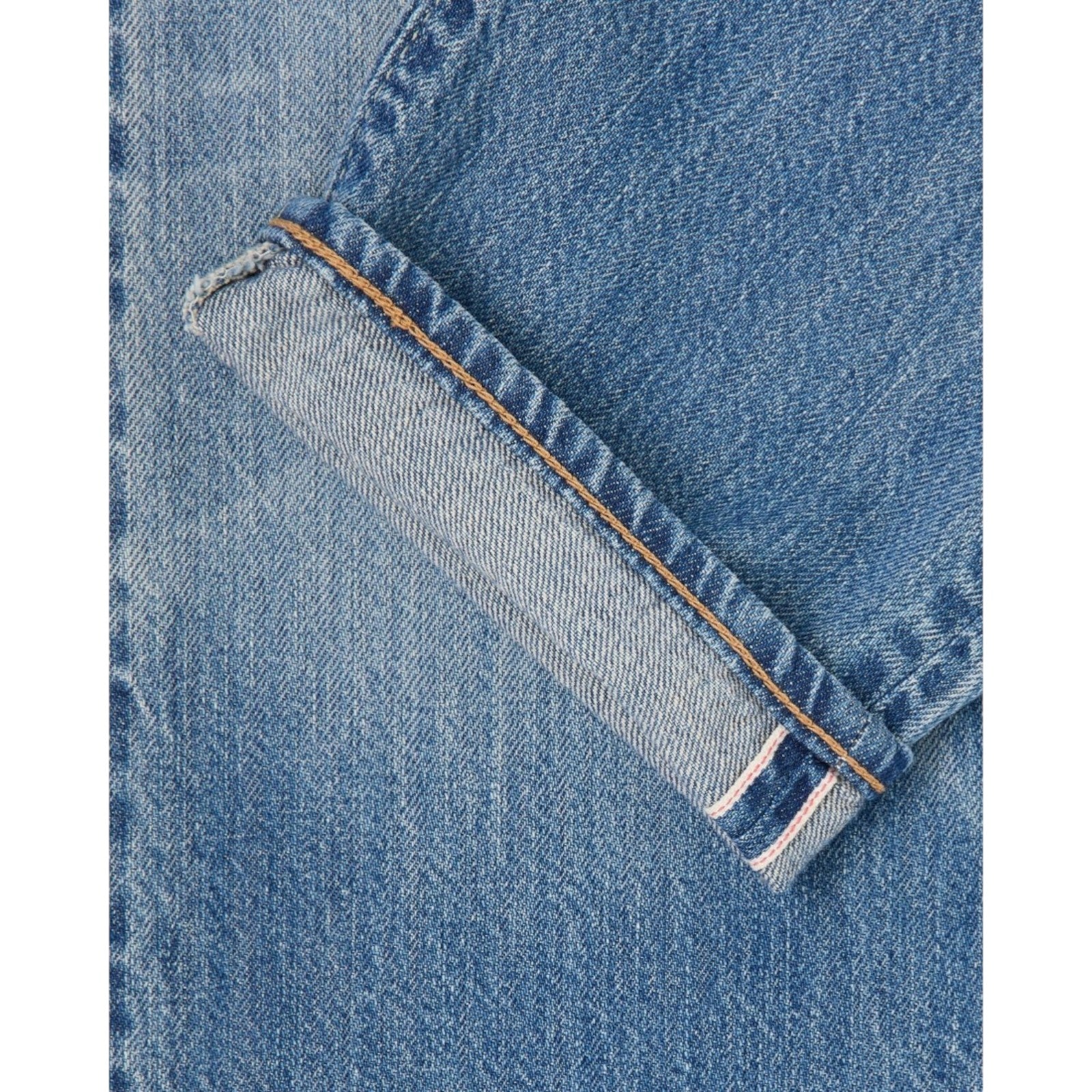 Dettagli Denim leggero rosso cimosato Kaihara Indigo da 10,5 oz 100% cotone Vestibilità regolare affusolata Altezza media Cuciture a contrasto Denim a 5 tasche Toppa in carta di cellulosa al 100% sul retro Chiusura con bottoni Prodotto in Giappone