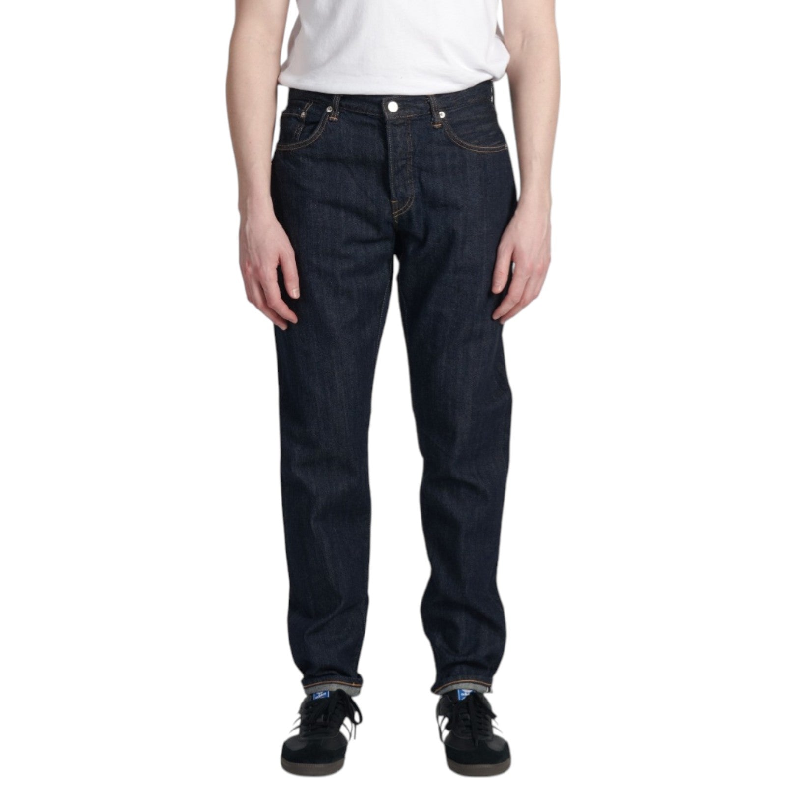I Regular Tapered Jeans sono una rivisitazione moderna del classico denim giapponese. Sono realizzati in denim Kaihara Indigo Lightweight Red Selvage da 10,5 once, con lavaggio blu per una mano più morbida, una struttura leggermente fluida e un aspetto leggermente vissuto. Presentano una vestibilità regular tapered, vita media, cinque tasche con patta e bottone, e sono rifiniti con una toppa in carta di cellulosa al 100% sul retro.